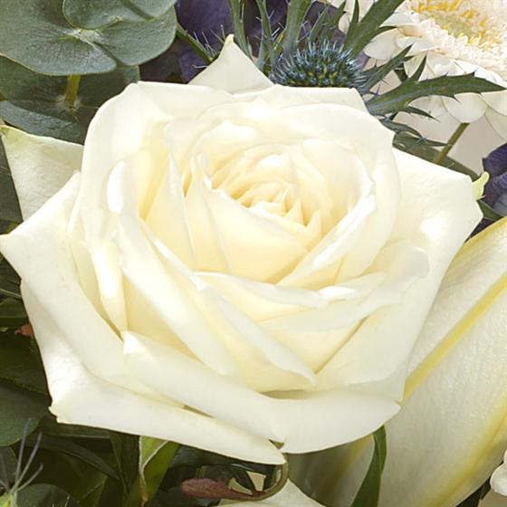 A serene hand-tied of white Roses and Lilies, purple Aconitum and Lisianthus.