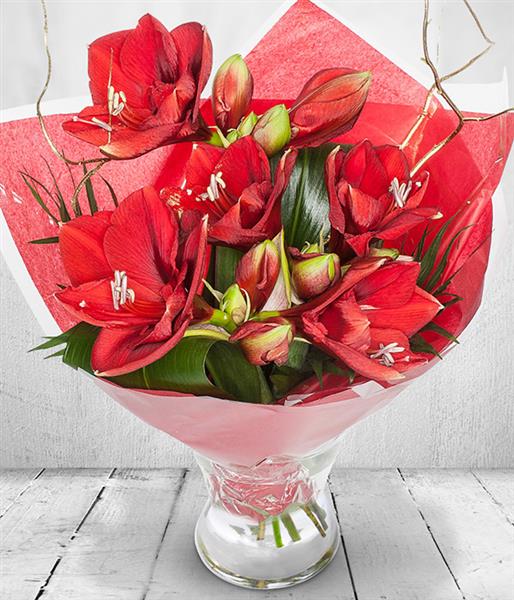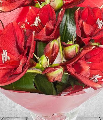 Undoubtedly a festive favourite, this bouquet brings red amaryllis extravagant palm leaf with decorative foliage.