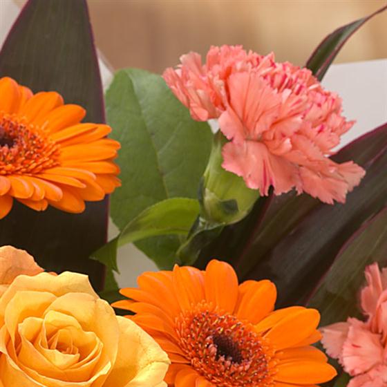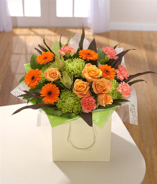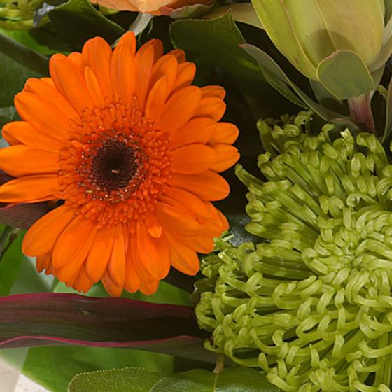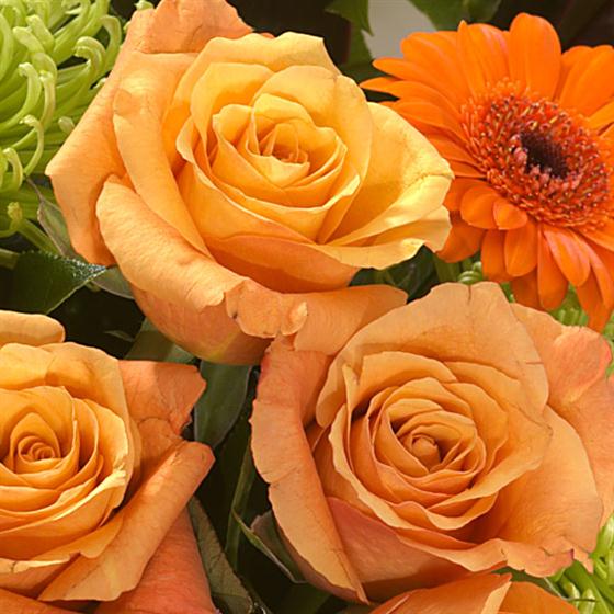 Orange Roses, Carnations and Germini set against green bloom Chrysanthemum.