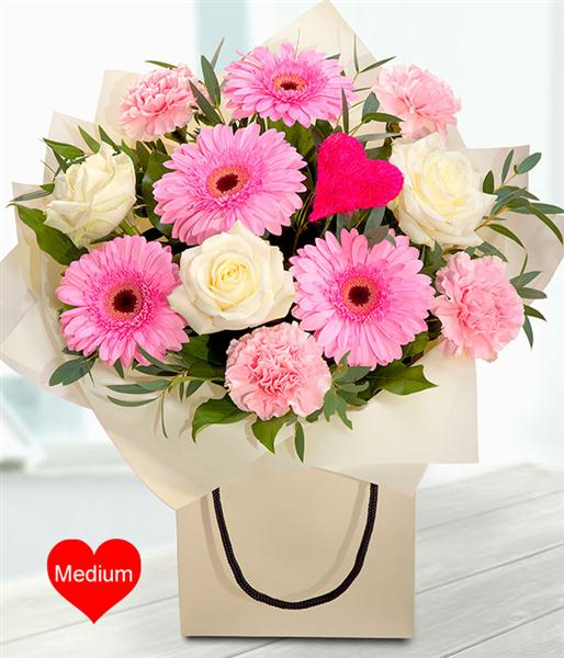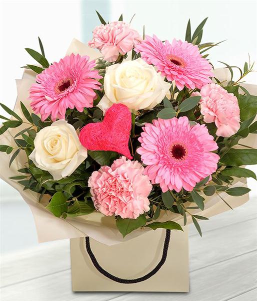 A delightfully delicate pink and white Valentine's Day gift bag Bouquet featuring white Roses, pink Gerberas and Carnations.
