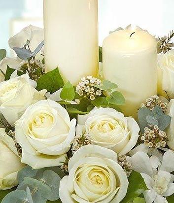 A classic white candle centrepiece arrangement with seasonal foliages and large headed White Roses