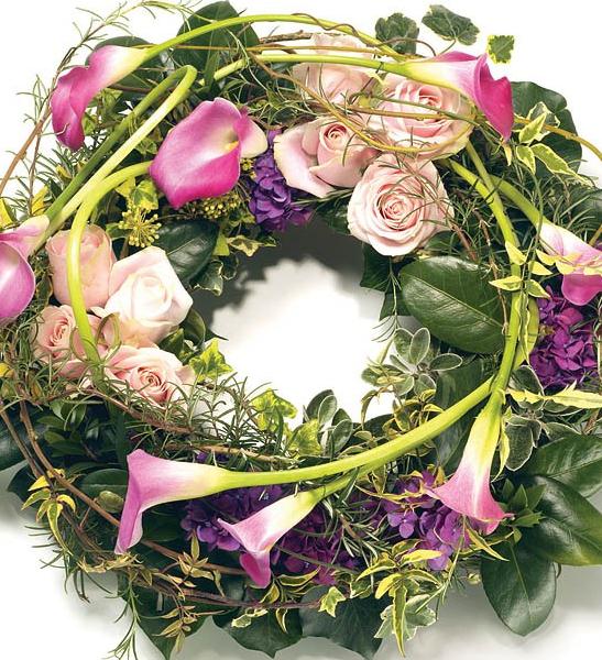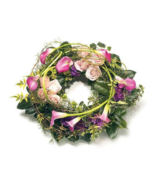 Stunning open round wreath in shades of pink and purple, including Calla Lilies, Roses, Hydrangea and complementary foliage. Size: Diameter - 36cm (14").