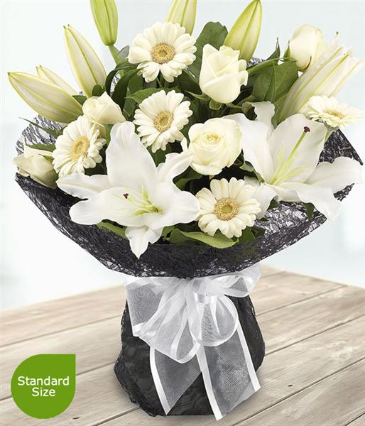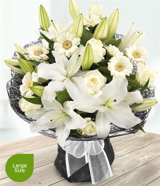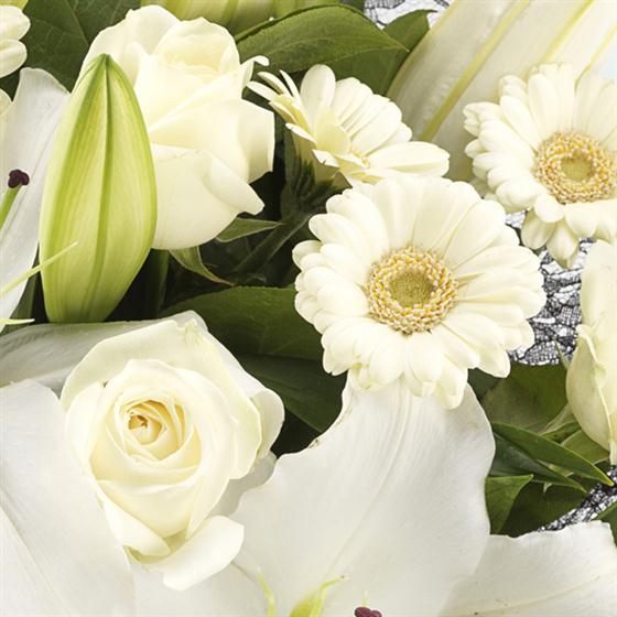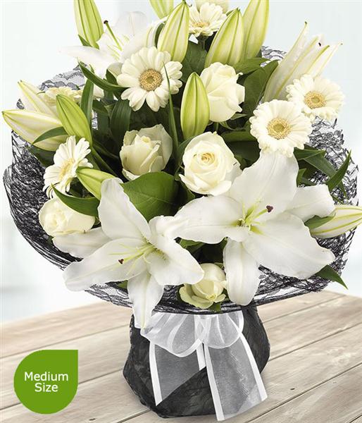 A stunning pure white Rose, Lily and Germini aqua pack bouquet exquisitely presented.