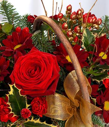 A gorgeous ruby red Christmas flower Basket bursting with Roses and Carnations. A flourish of Holly, Hypericum berry and Blue Spruce complete this seasonal arrangement perfectly.