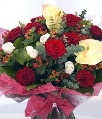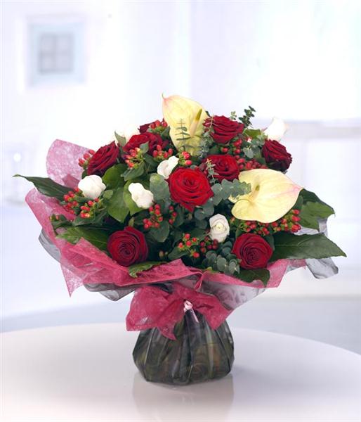 A large hand-tied flower bouquet with red Roses, Hypericum and Anthuriums. The bouquet comes beautifully packaged in an aquapack for instant display.
