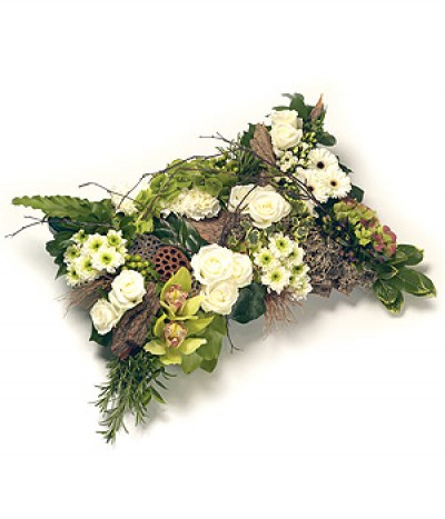 A stunning textured pillow design in shades of green & white, featuring Roses, exotic Orchids, Chrysanthemums, Hydrangea and complementary foliage. Size: Height - 33cm (13") Length - (18").