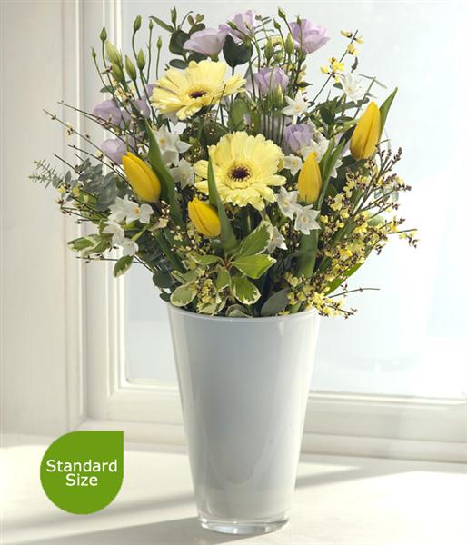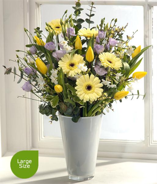 A delightful spring flower bouquet in pastel shades featuring bright sunshine yellow Tulips. Lavender Lisianthus and Paperwhite Narcissi sit perfectly alongside delicate lemon Germini. A fantastically fresh and calming colour combination.
