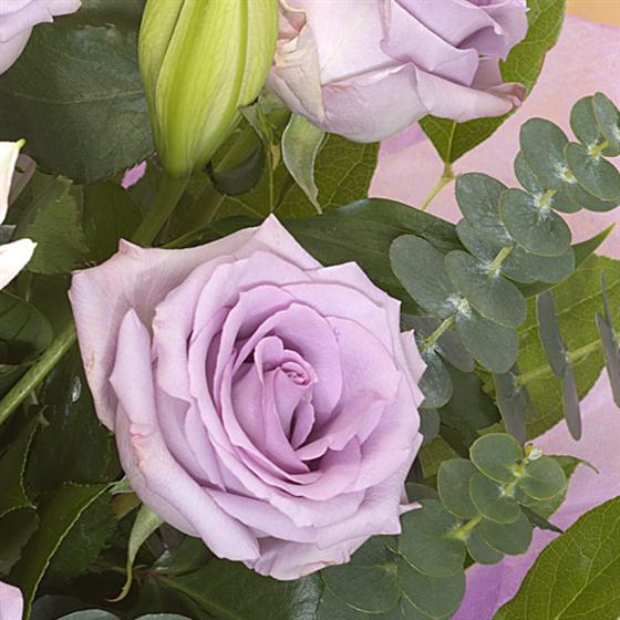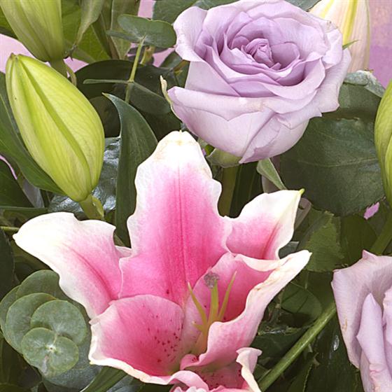 Lavender Roses and pink Lilies make this arrangement beautifully soft and gentle.