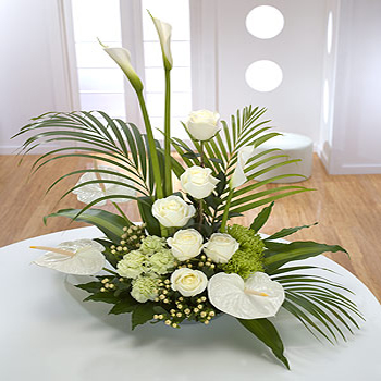 Magnificent cream Roses, white Anthurium and Calla Lilies set the tone for this grand design.