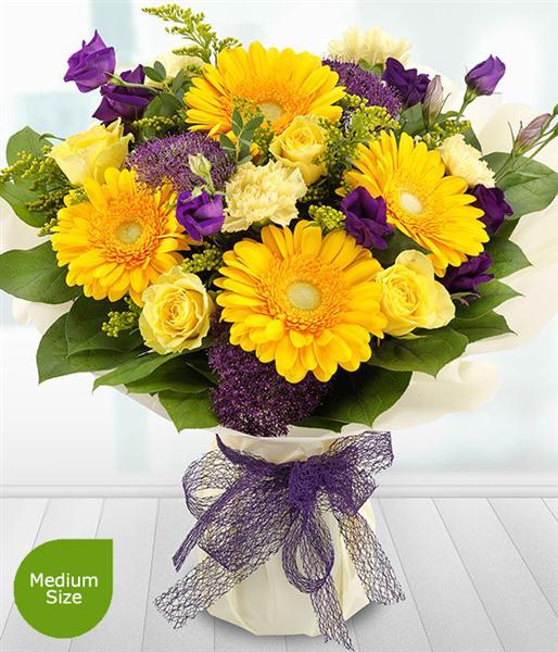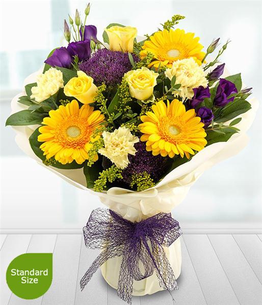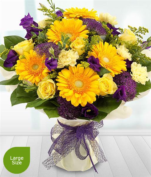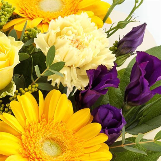 An aqua pack bouquet with a fabulous mix of bright yellow Roses, Gerberas and Carnations married with deep purple Lisianthus and Trachelium blooms.