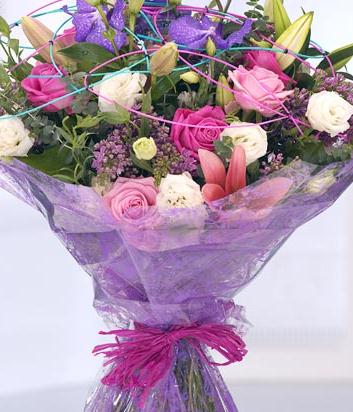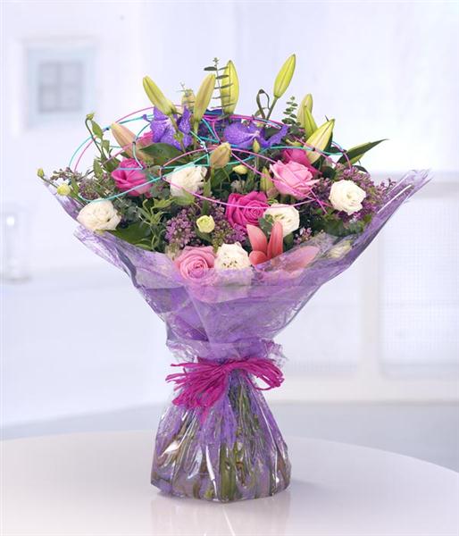 A wonderfully modern hand-tied flower bouquet with Orchids, Lilac, pink Roses, pink Lilies and Lisianthus. Strikingly packaged in an aquapack for instant display
