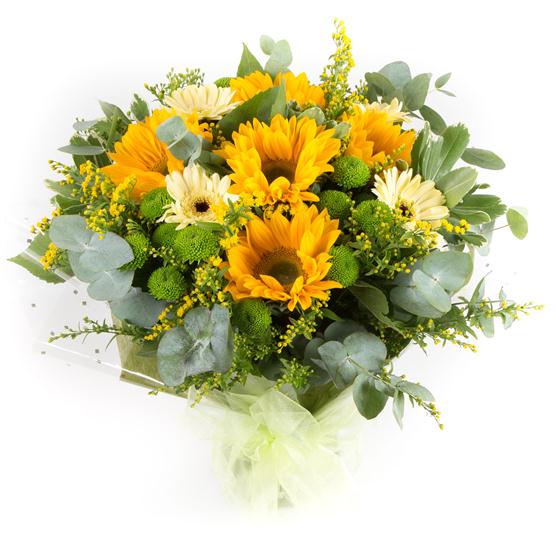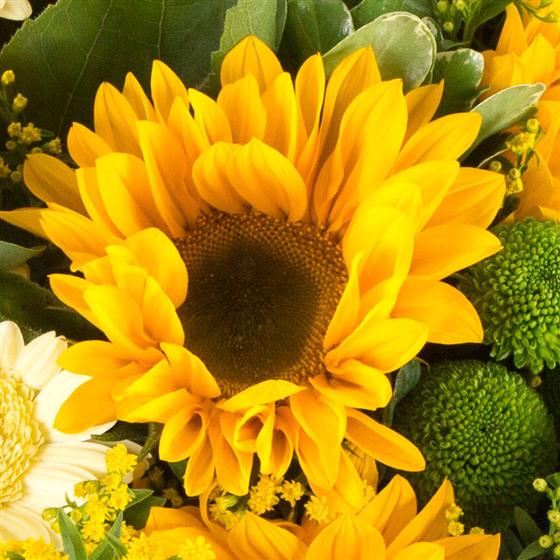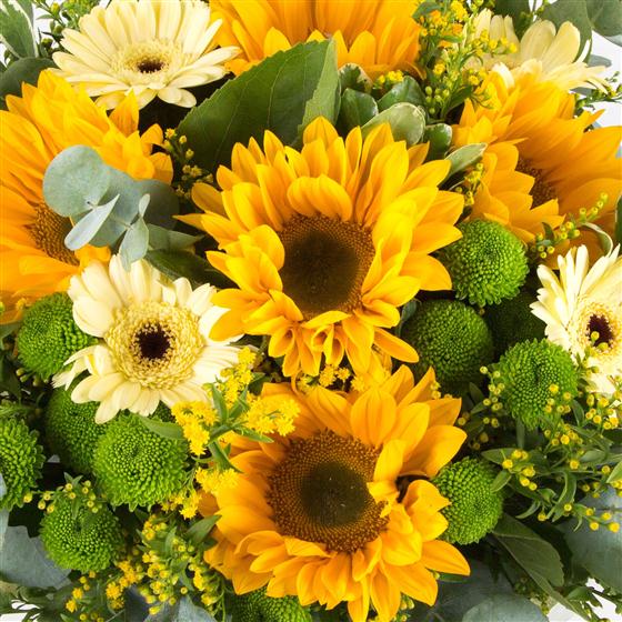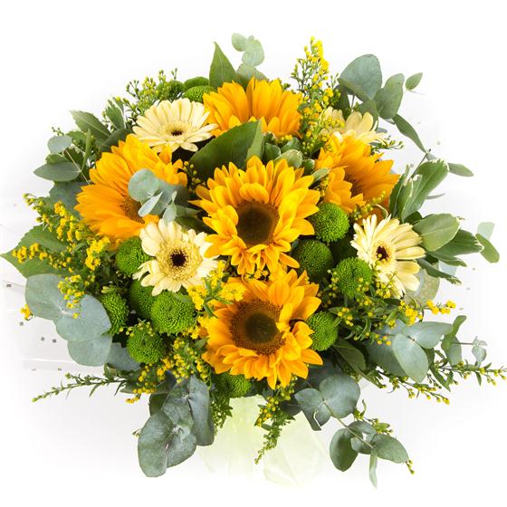 Sunflowers, mini gerberas and lime green kermit chrysanthemums hand-tied with seasonal foliage and golden solidaster.