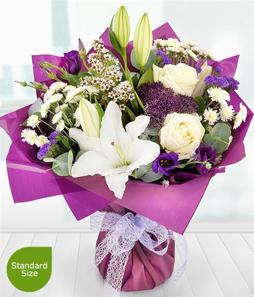 A sophisticated arrangement of crisp, white Lilies, Roses and Wax Flowers married with simply sumptuous purple Lisianthus and Statis blooms, finished with a dash of Eucalyptus and Salal.