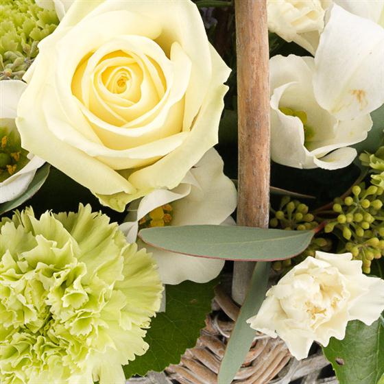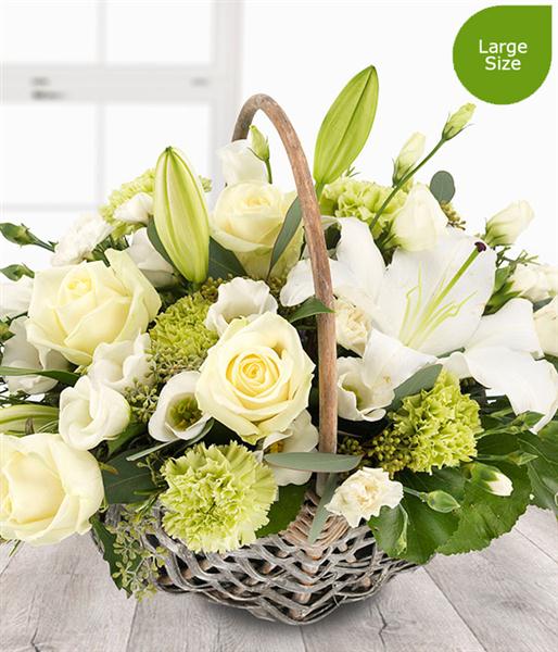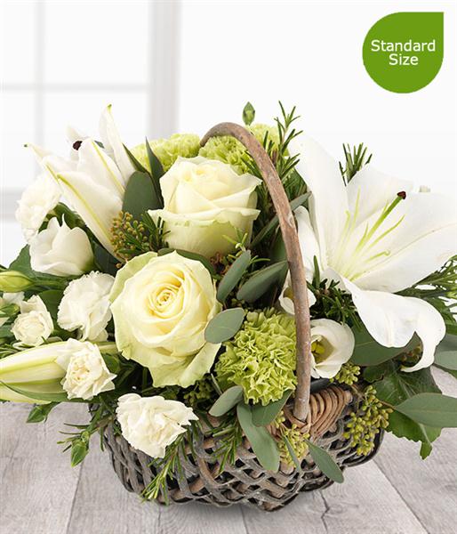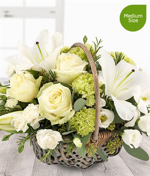 An incredibly elegant pure white flower basket arrangement. White Roses, Lilies, Lisianthus and Spray Carnations coupled with green Carnations and just a hint of Rosemary.